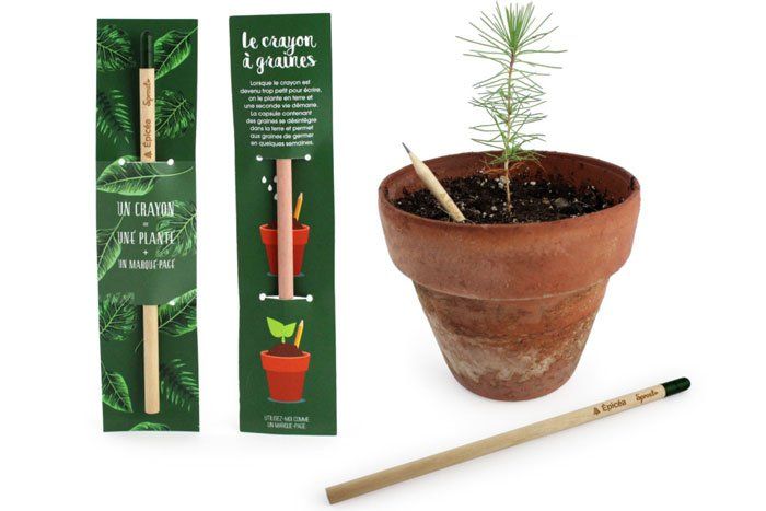 Ce crayon est original et surprenant : il est capable d’émettre des racines et de donner naissance à une plante. Et si un simple crayon à papier agir en faveur de l’environnement ? Crayon avec une mine graphite en bois de cèdre. Il contient une capsule de graines à son extrémité, après usage, quand le crayon devient trop court, il suffit de planter le crayon dans la terre, d’arroser et on a la surprise de voir germer l’une des 7 variétés au choix : Basilic, Sauge, Thym, Tournesol, Tomate cerise, Myosotis, Marguerite, Epicéa (sous réserve de stock à la commande)